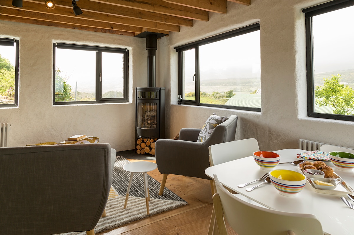 Ang mga tradisyonal na nakakatugon sa moderno sa ganap na na - renovate na Farm Cottage na ito ay nakatakda sa isang gumaganang maliit na bukid. Tinatanaw ng maluwang na loft bedroom na may komportableng reading nook ang mga bukid at hayop, habang pinupuno ng mga dramatikong tanawin ng bundok at lambak ang mga bintana ng liwanag. Itinayo gamit ang lokal na galing na kahoy at bato, at natapos gamit ang mga pasadyang cabinetry at artisan na muwebles, ito ay isang natatanging retreat - perpekto pagkatapos ng hiking, pagbibisikleta, buhay sa bukid, pagmumuni - muni, o mga gabi ng masiglang trad music.