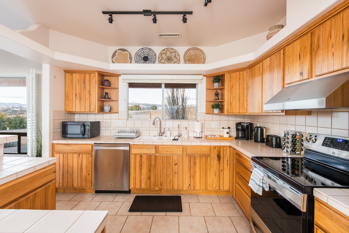Tumakas sa bagong 3 silid - tulugan na tuluyan na ito na may magandang dekorasyon, na nasa 3 ektarya kung saan matatanaw ang Oak Creek. Mga magagandang tanawin ng nakapalibot na Jerome at Mingus Mountains. 5 minuto lang mula sa mga gawaan ng alak, tindahan, at restawran. Mapayapa, tahimik, at komportable sa dalawang patyo sa labas na nagtatampok ng komportableng muwebles, grill, at fire pit ng gas sa labas na perpekto para sa pagniningning. Talagang espesyal ang tuluyang ito dahil sa iniangkop na kusina at mga disenyo ng sining sa iba 't ibang panig ng mundo. Posible ang mga aso - makipag - ugnayan sa akin para sa anumang tanong!
