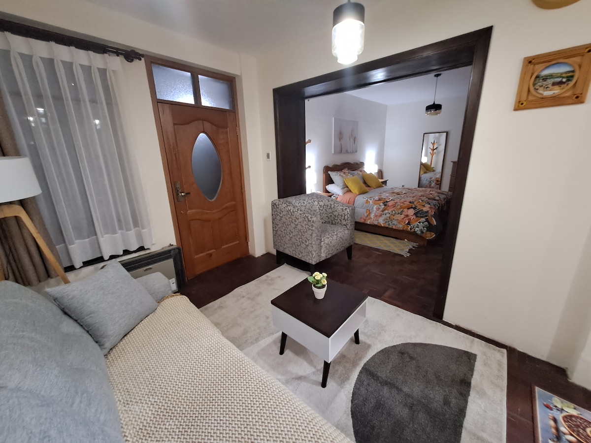 Bonito departamento de 1 dormitorio completamente remodelado ubicado en casa céntrica en el barrio de sopocachi en La Paz . Se encuentra en la planta baja. Es muy acogedor y muy tranquilo. Cuenta con bonita cocina tipo americana completamente equipada. Cuenta con baño privado. Acceso directo a la terraza.