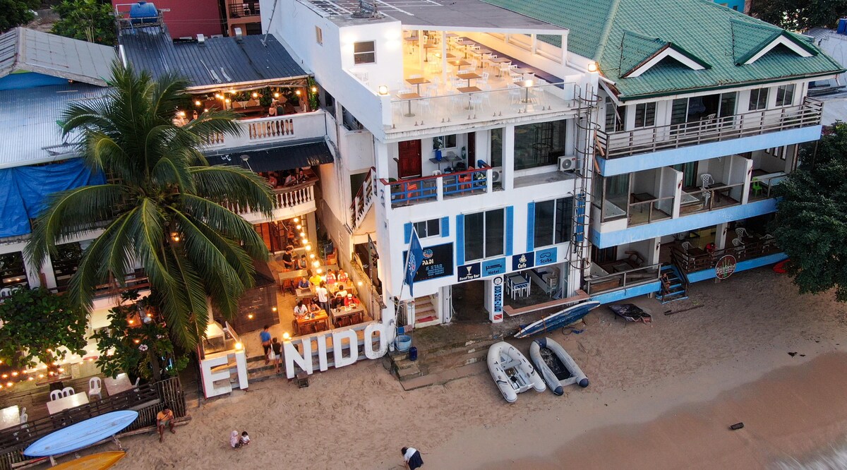 Sharing a dormitory in the centre of El Nido, above the Submariner Diving Centre. The Beach House is a chilled out beachfront retreat located centrally in El Nido. The newly built property offers a breezy beach vibe and access to some of the best sunsets in the world. Its unique location is perfect for enjoying all the amenities in town or waking up just steps away from the many water-based adventures offered by the hotel’s in-house dive centre, Submariner.