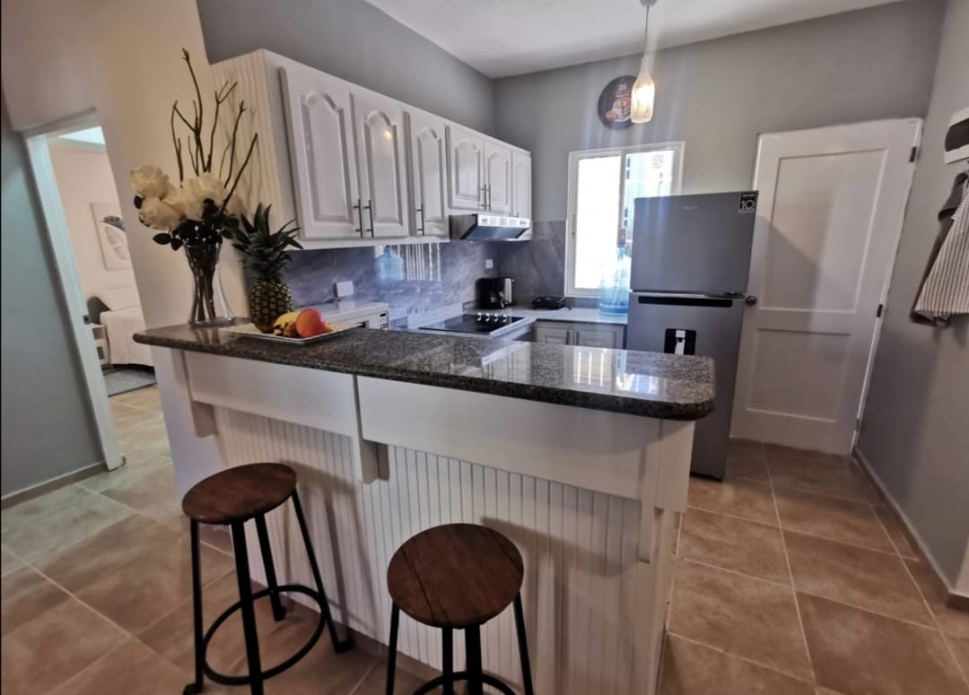 Maganda ang lokasyon ng komportable at kumpletong apartment na ito na 3 minuto lang sakay ng kotse (o 18 minutong lakad) ang layo sa mga pangunahing beach ng Bávaro's Cortecito, mga supermarket, restawran, bar, gym, at sentro ng bayan. Madali itong mapupuntahan mula sa dalawang pangunahing kalsada sa lugar na mabilis na kumokonekta sa highway at Avenida Alemania. Matatagpuan ang apartment sa isang umuunlad na residential area kaya posibleng may malapit na konstruksyon. Gayunpaman, nananatiling mapayapa, komportable, at mainam ang komunidad para sa nakakarelaks na pamamalagi.