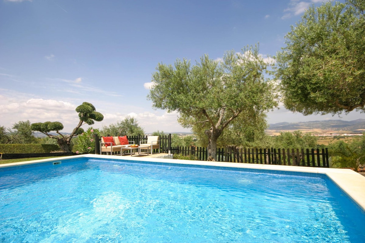 Matatagpuan ang kamangha - manghang villa na 1 km lamang mula sa Ronda na may lubos na detalye sa kahabaan ng 10,000m2 nito. Isawsaw ang iyong sarili sa isang natatanging rural na setting kung saan maaari mong matamasa ang mga pribilehiyong tanawin ng lungsod, magpahinga sa mga hardin nito, solarium, barbecue at pribadong pool. Mayroon itong tuluyan na komportableng inangkop at pinalamutian sa huling detalye: orihinal na muwebles na may estilo ng Rondeño, mga bentilador sa kisame, kumpletong kusina, shower, air conditioning...