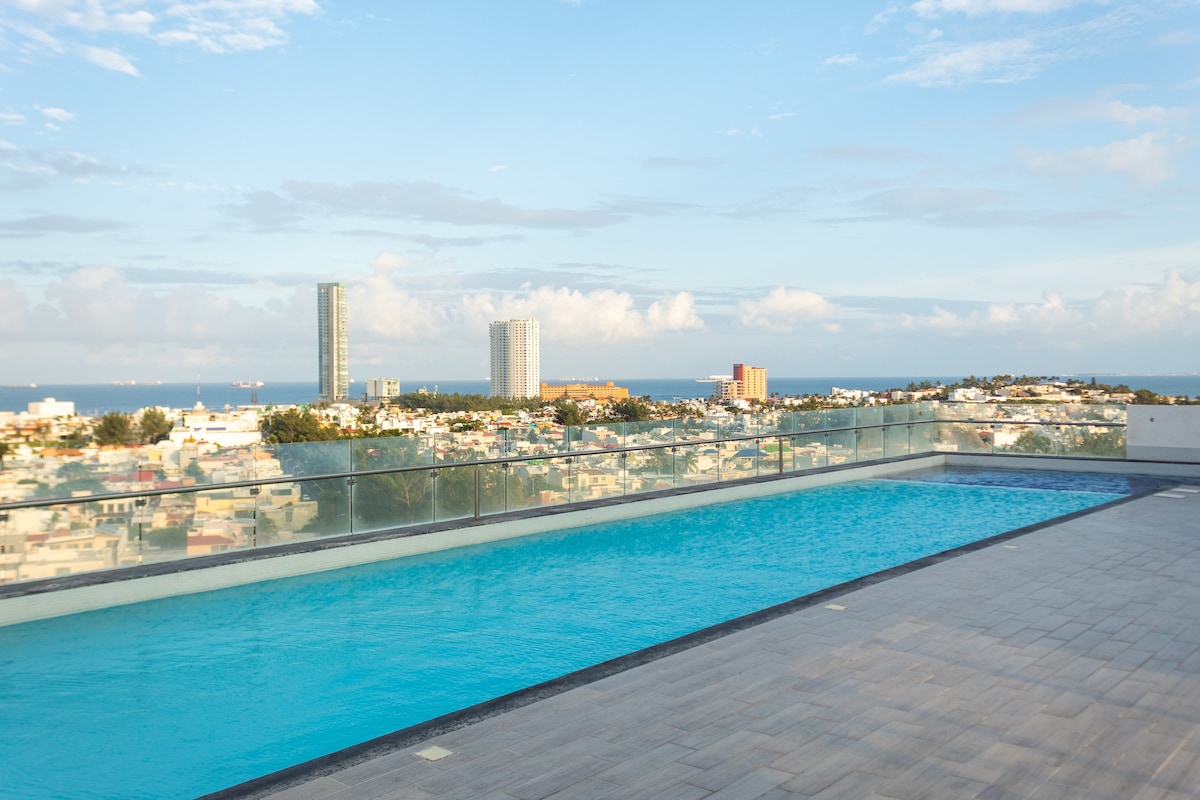 Komportable at komportableng apartment, perpekto para sa paglalakbay ng pamilya o negosyo. Matatagpuan sa isa sa mga pinakamahusay na lugar sa Veracruz, ito ay magbibigay - daan sa iyo upang maglakad sa iba 't ibang mga punto ng turista: 3 sa mga pinakamahusay na mga parisukat (Andamar, Américas at Plaza Sol ), pati na rin ang boulevard at ang beach. Ganap na naka - air condition; mayroon itong sala, silid - kainan, kusina, 2 silid - tulugan, 2 banyo, cable TV, internet, garahe, pool, gym at 24 na oras na serbisyo sa pagmamatyag.