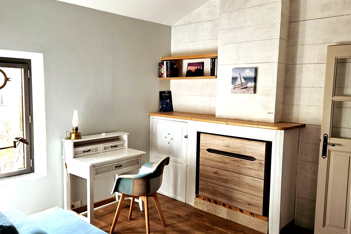 Kaakit - akit na studio na may napakaliwanag ,tahimik at independiyenteng karakter na matatagpuan sa itaas ng bahay ng may - ari. Isang malaking banyo na may toilet . Isang wardrobe . Isang bukas na kusina. 2 modular 90 kama kung nais (maliit na dagdag na kutson kung bata . )Malugod na tinatanggap ang mga kasama na may apat na paa. 100 m mula sa dagat .ballades sa calanques . Mas mainam na dalhin ito pero mapupuntahan ang istasyon ng tren ng Sncf habang naglalakad