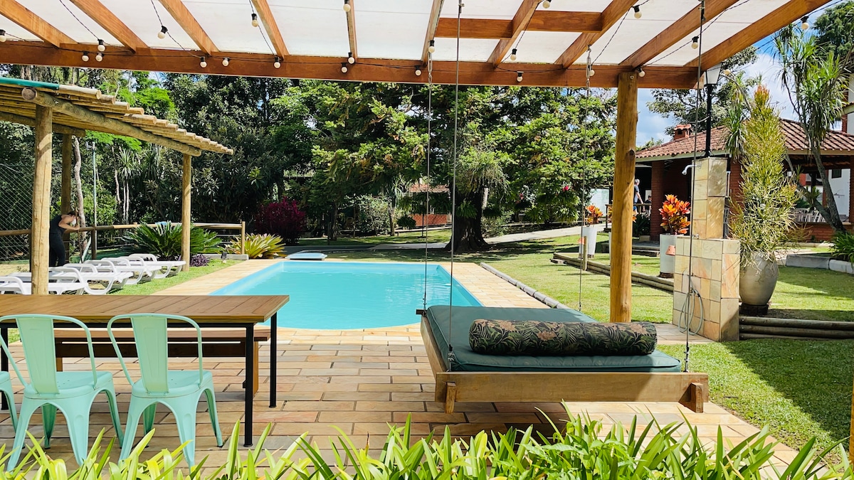 Ang Nossa chácara ay nasa isang madaling mapupuntahan na kanayunan, sa loob ng isang gated condo na may 24 na oras na seguridad. Bukod pa rito, napapaderan ang lahat ng aming lupain. Ang bukid ay 2,000 metro na may maraming espasyo at berde para sa paglilibang, na may mga pana - panahong puno ng prutas at swimming pool, lahat ay eksklusibo!!! Pinapahalagahan at pinalamutian namin ang aming tuluyan nang may maraming pagmamahal at de - kalidad na item na masisiyahan sa iyo na gustong magpahinga at magkaroon ng privacy. Lugar para magpahinga! Mabilis na Wi-Fi, mahusay para sa HOME OFFICE.