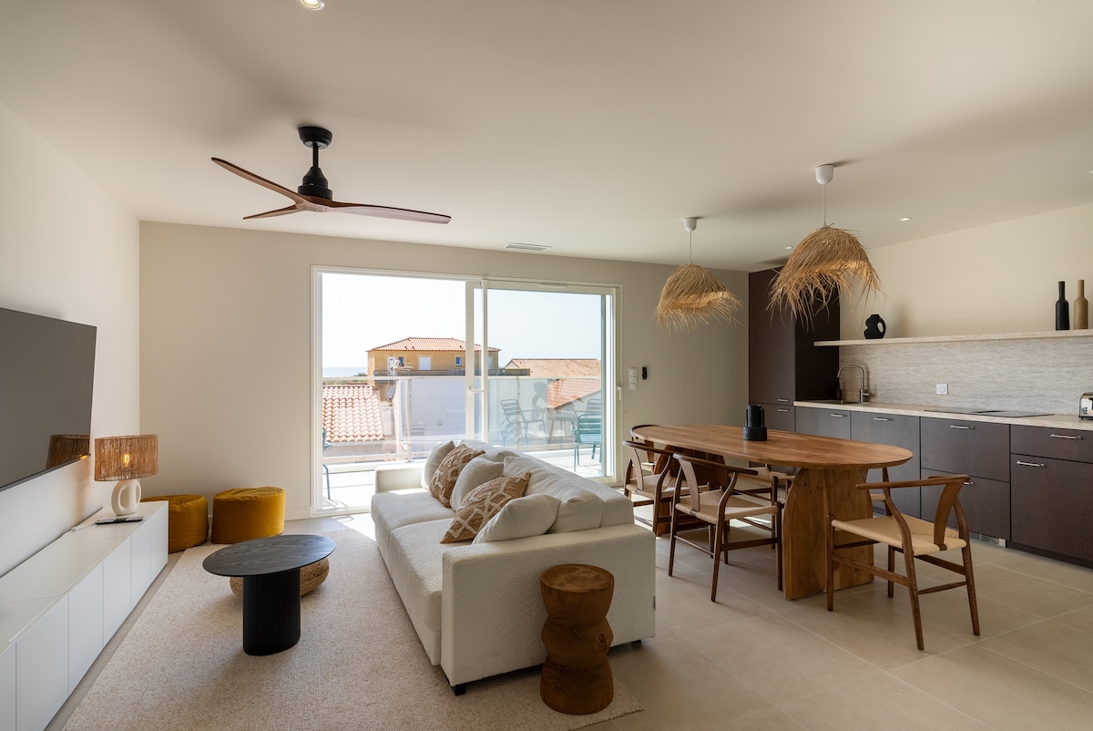 Profitez d’un appartement baigné de lumière avec sa terrasse face à la mer et la plage, sans vis à vis. Appartement 2 pièces d'environ 30 m2, terrasse 10 m2 et place de parking privative. Prestations de confort dans un style moderne et épuré. Il est situé au 2è étage (sans ascenseur) d’une résidence très calme. Le linge est fourni (lit + toilette). Literie récente (2024) 140x190. 2 TV. WIFI (fibre). Idéal pour 2 personnes
