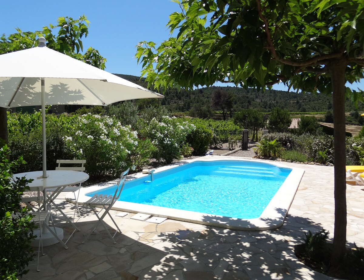 Villa Carignan na may heated private pool, at malalawak na tanawin ng ubasan 25 km mula sa dagat. Matatagpuan sa isang maliit na kaakit - akit na nayon, sa gitna ng Corbières, malapit sa lungsod ng Carcassonne , ang mga kastilyo ng Cathar country, abbeys, sandy beaches at Canal du Midi. Matatagpuan ang kaakit - akit na villa sa isang maliit na burol sa pasukan ng nayon na may mga tanawin ng mga ubasan at ng scrubland. Ang dekorasyon ay hinahangad, Mediterranean garden na 1000 m2. May kulay na terrace na may mga muwebles sa hardin.