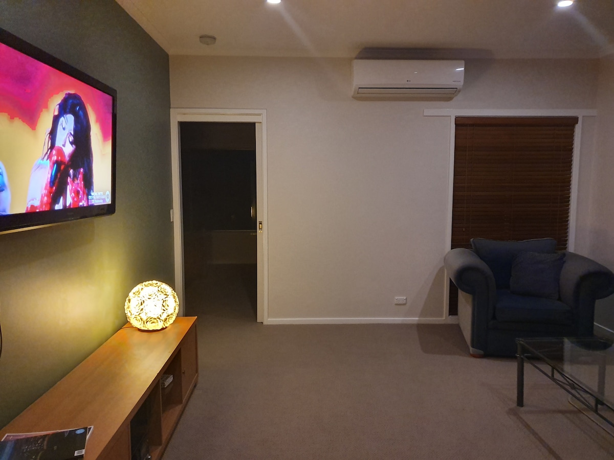 Light, bright and spacious. From the moment you walk in you'll feel calm and relaxed. Fire up the wood fire or simply press a button for instant warmth or cool. Comfy Koala mattresses on beds also equipped with electric blankets. Clean, white stone bench tops and a large cooktop and oven if eating-in is your plan. Stylish and comfortable living spaces. Streamlined bathroom and ensuite, each with a large glass-walled shower. Enjoy the grassy front deck area or sit around the fire pit at the back.