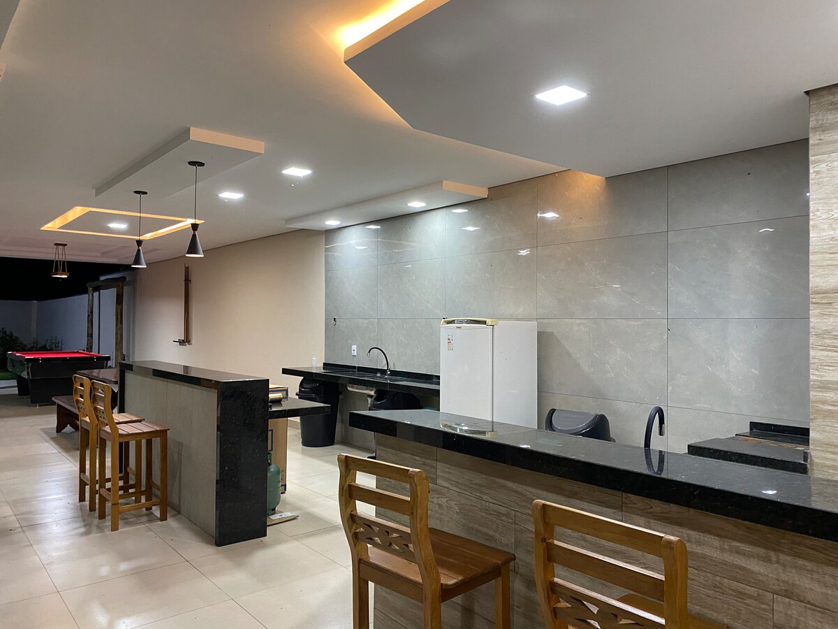 Tuluyan na may estilo ng kolonyal sa labas at sobrang kontemporaryo at gumagana sa loob, pagpipino at kaginhawaan sa bawat kuwarto. Mayroon itong swimming pool at soccer field na lipunan! Magandang lokasyon, eksaktong 1,400 metro mula sa pangunahing abenida ng lungsod , kung saan makakahanap ka ng mga supermarket, botika, at panaderya . Mainam ang Taquari River para sa pangingisda at water sports! Halika at tamasahin ang aming mga likas na kagandahan, Coxim sa kabisera ng isda at lupain ng paanan ng Cedro.
