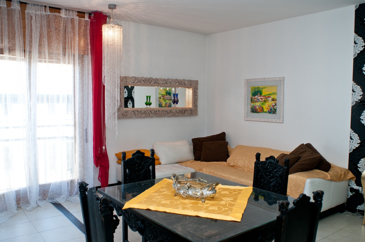 La zona giorno e la cucina compongono uno splendido open space. Nella zona notte abbiamo una camera matrimoniale con armadio e cassettiera, bagno privato con doccia, una seconda camera con letto a una piazza e mezza, la terza stanza adibita a studio ha un divano letto da una piazza e mezza e un armadio a muro. In questa zona troviamo anche un bagno con doccia e una lavanderia. Completano l’appartamento due posti auto uno esterno e uno chiuso. L'appartamento è dotato di condizionatore.