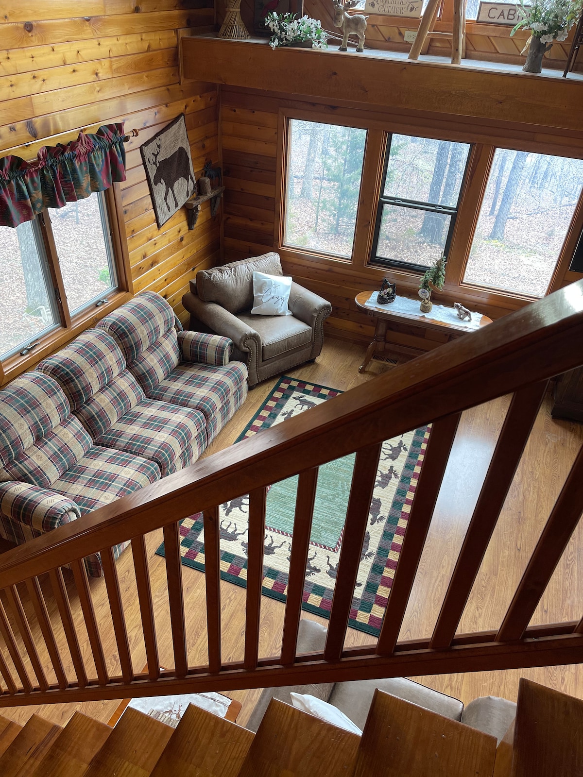 A warm, pine honeymoon cabin surrounded by pastoral Ozark countryside. The Meramec River flows through this seventh generation family farm. Cozy interior includes a kitchenette, dining area, and double bed on main level. All your cooking intensils are provided with coffee, tea, and paper products. DVDs and books available await you up the spiral staircase in the loft. Full bed on main level and two singles bed upstairs. Expansive view from your front porch of the highest bluffs on the Meramec.
