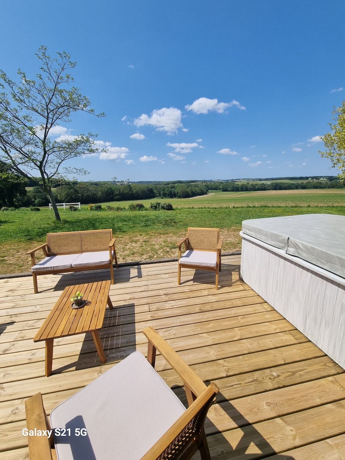 Isang maliit na kahoy na bahay na may tahimik na hardin, sa gitna ng isang organic vegetable farm, May perpektong kinalalagyan para sa mga pagha - hike, humanga sa mga guwang na daanan, kakahuyan, medyo parang at sapa o i - recharge lang ang iyong mga baterya. Ito ay isang paanyaya na idiskonekta at bumalik sa kalikasan. Mula sa timog na nakaharap sa terrace na may barbecue, hapag - kainan, muwebles sa hardin... maaari mong obserbahan ang burol, ang kagubatan sa harap mo at hayaan ang mga kanta ng ibon na humihimlay sa iyo.