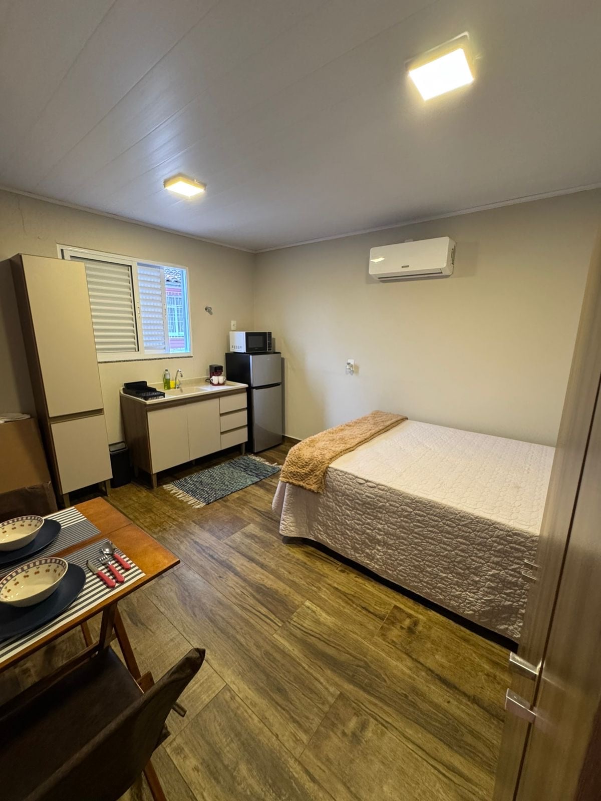 Segurança, conforto e EXCELENTE localização. O espaço acomoda até 3 pessoas e a localização é perfeita. Próximo à Av Centenário, fica perto de mercados (BISTEK, ANGELONI e GIASSI) e restaurantes. O local conta com uma suíte com ar-condicionado e um armário para estadias curtas. A sala conta com um sofá-cama e um SMART TV, com Wi-Fi incluso. A cozinha é completa (microondas, fogão de indução, panelas, talheres) Ideal para casais, pequenas famílias ou viagens a trabalho.