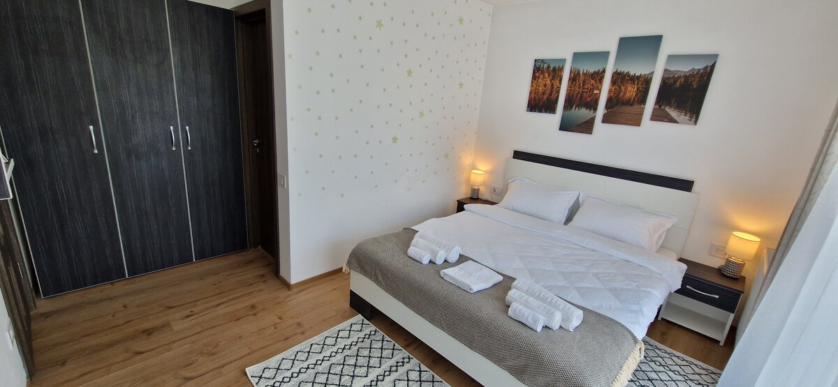 !!! PANSIN !!! Para sa mga taong bukod pa sa reserbasyon ang babayaran sa pagdating 50 ron/ araw, kung hindi, kakanselahin ang reserbasyon ayon sa mga kondisyon sa platform ng pagbu - book. May air conditioning, wifi, at libreng paradahan ang apartment. Puwede naming ibigay ang mga sumusunod nang may bayad: Dagdag na higaan 190x80 - 50 ron/araw Baby cot - 30 ron/araw Upuan sa mesa para sa mga bata - 10 ron/araw Istasyon ng pagsingil ng de - kuryenteng kotse - 1.8 ron/kw