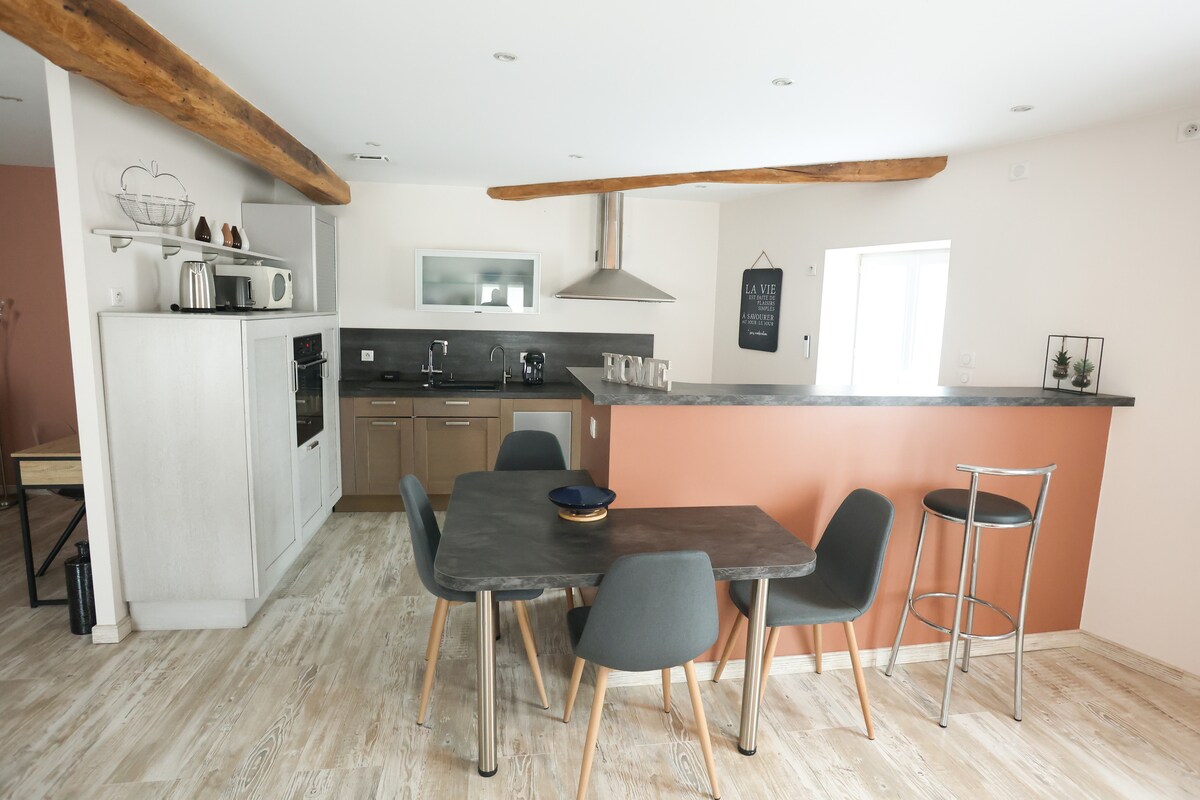 Gîte la Bignonette - Ang kaakit - akit: Country house na may mga nakamamanghang tanawin ng lawa (sigurado ang disconnected na pamamalagi). Ganap na naayos (kusinang kumpleto sa kagamitan, napakahusay na pag - init, de - kalidad na kobre - kama). Heritage village: dungeon, Romanesque church, sinaunang kuta. Maraming available na aktibidad: gastronomy, vineyard, cultural (arts), sports (hiking, horse riding, golf atbp.), wellness (spa, masahe) at pamilya (ski game).
