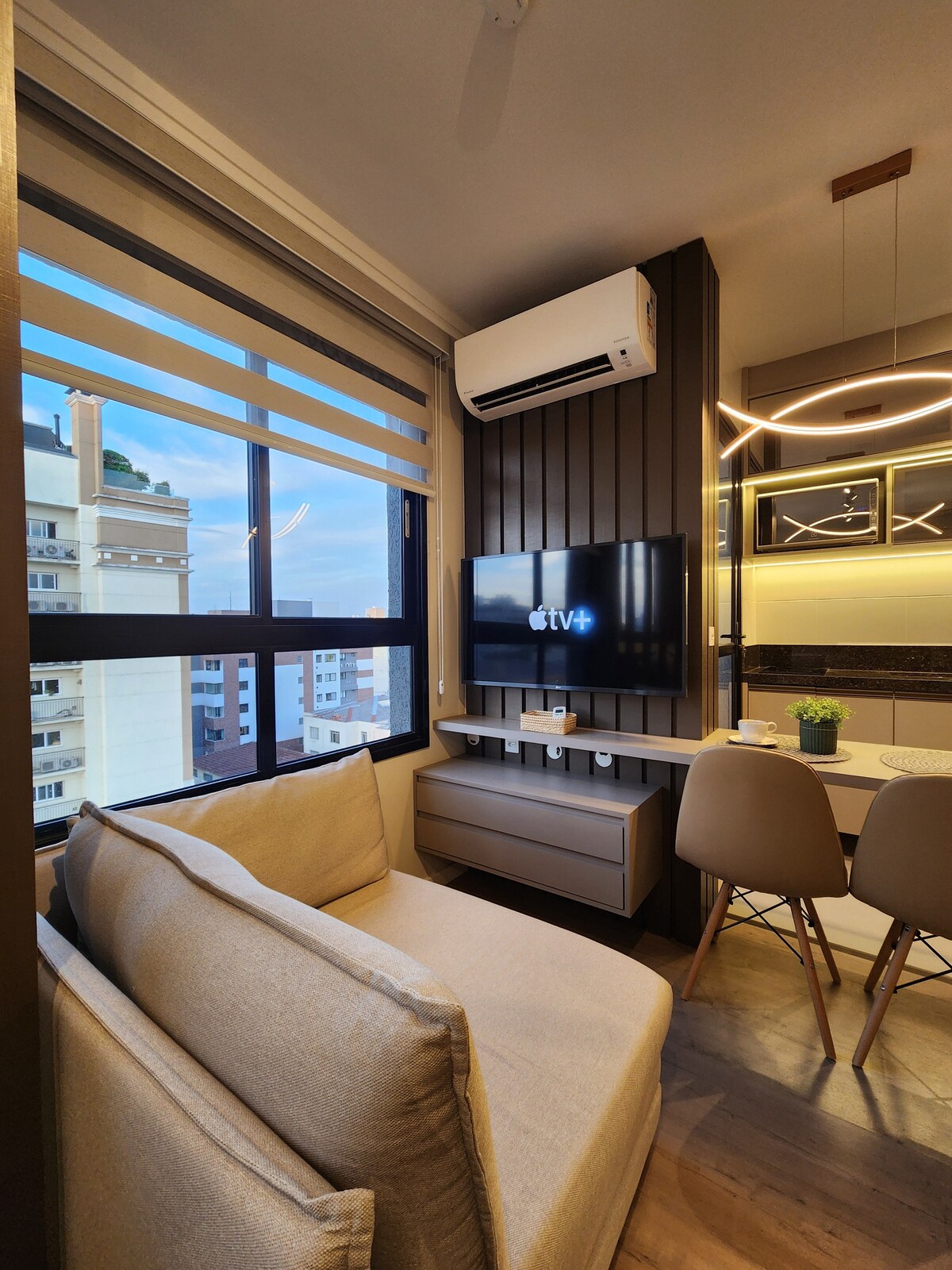 Modernong studio, bago, komportable, perpektong lokasyon, na may magandang tanawin mula sa balkonahe, lalo na sa gabi . Mabilis na wifi, desk, 55"smart TV, queen bed. Air conditioning (mainit/malamig). Washer at dryer at magandang isla sa kusina. 50m2 ng napaka 27th style, Tahimik. Sa Center/Batel, malapit sa mga tindahan, bangko, mall, gastronomic hub at Ospital . Sa gusali :Pool, gym, games room, sauna, jacuzzi, 24 na oras na concierge.