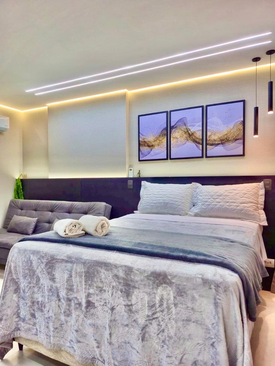 Modern at komportableng studio, na ganap na idinisenyo para sa Airbnb. Kumpletong kusina na may Refrigerator, Stove, Microwave , 40"Smart TV, Hotel Standard Premium Box Bed. Mayroon itong cable TV at wifi package. Malapit sa merkado, parmasya, Shopping Curitiba at panaderya. Safety net sa mga bintana at sofa bed, puwede mong tahimik na dalhin ang iyong (mga) anak. Moderno, bagong gusali na may ganap at kumpleto sa gamit na fitness center, party room at roof top leisure area. Mag - enjoy sa mga nakakamanghang araw sa aming tuluyan.