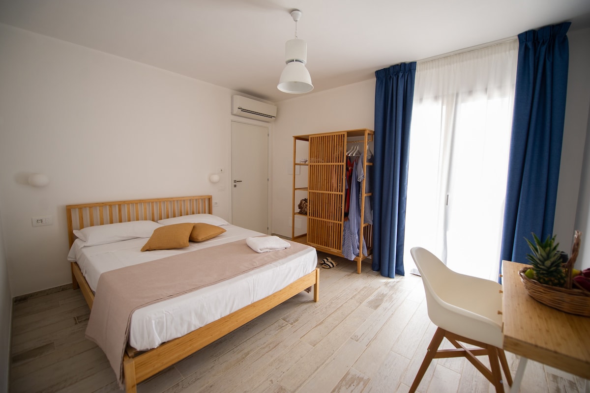 La camera al primo piano è ampia e luminosa, con arredamento nuovo e lineare. Le serate sono fresche, ma è presente un ventilatore a soffitto. La stanza da bagno è spaziosa, dotata di vasca e doccia a pioggia, accessibile direttamente dalla camera. Abbiamo riservato una porzione di terrazzina per asciugare teli e costumi.