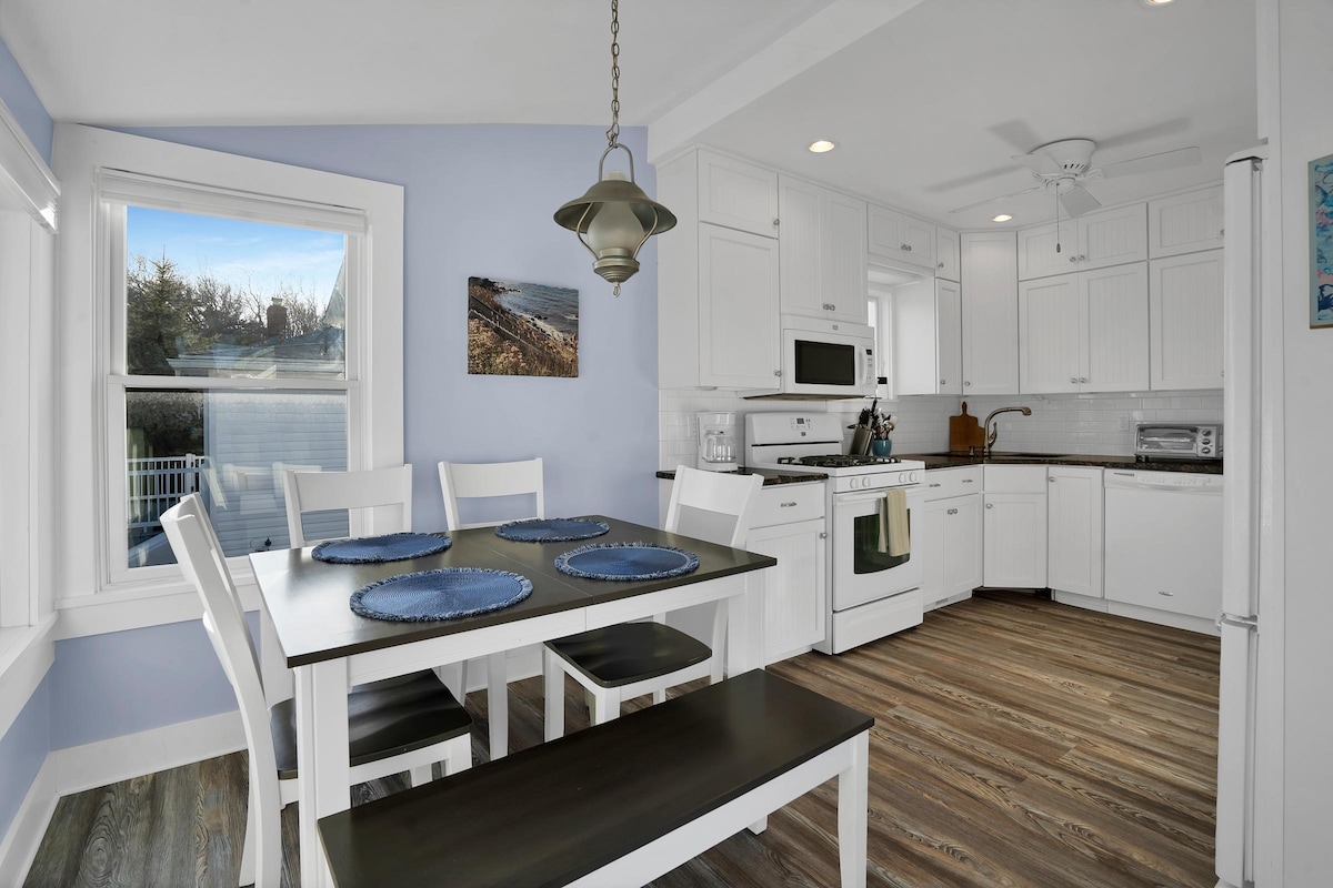Pribadong bungalow na may hiwalay na pasukan sa makasaysayang tudor home. Maluwag na silid - tulugan na may king - sized bed, maliit na kusina at banyo. May dalawang bisikleta, cable TV, internet, AC, beach towel, paradahan, meryenda, kape at tubig. Walking distance sa beach, mga restawran, tindahan, ubasan, grocery, bukid at pamilihan ng isda. Isang bloke ang layo ng Jitney stop!