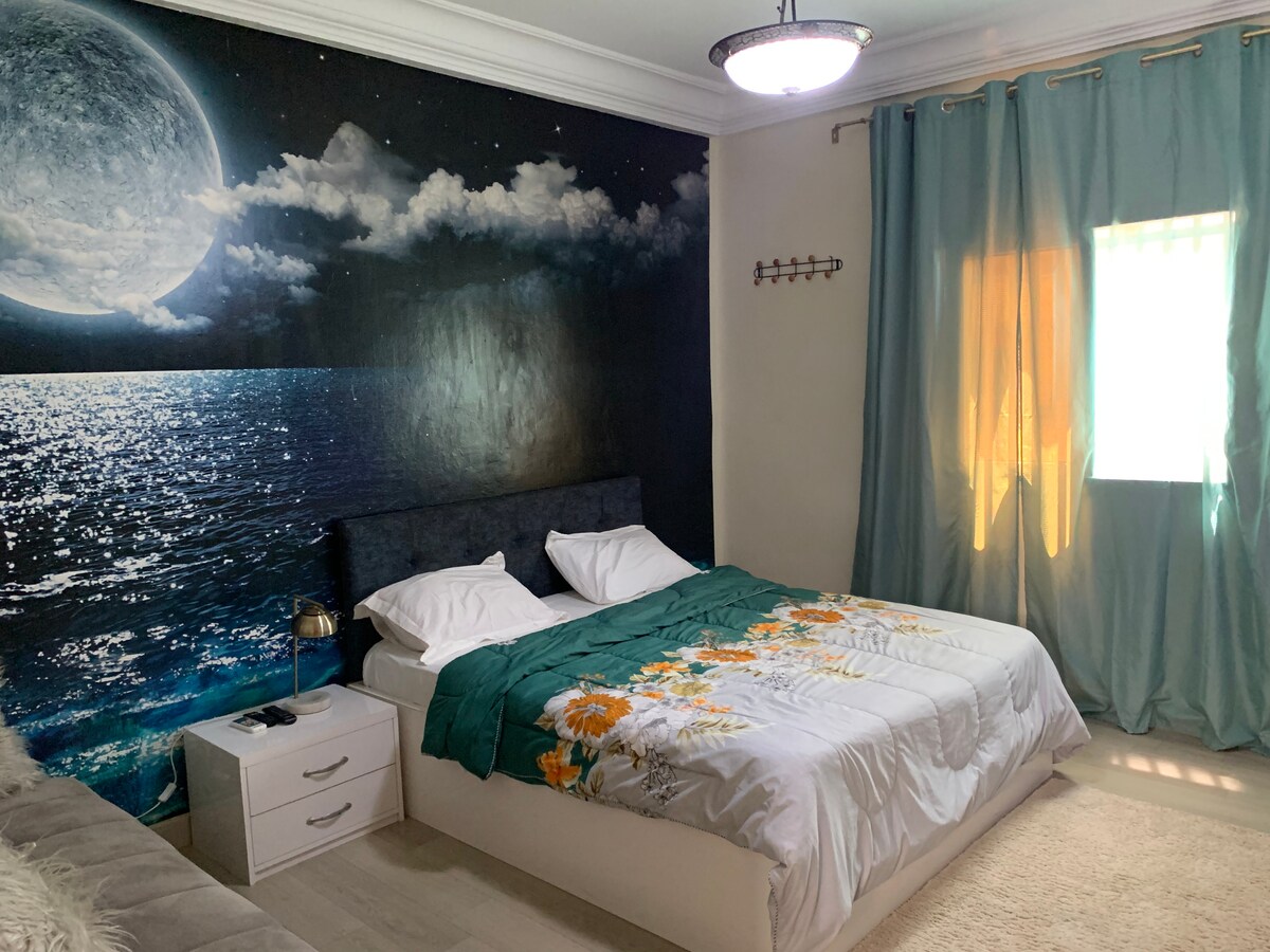 Logement de 2 chambres, salon, 2 salles de bain, cuisine avec internet fibre, TV (Netflix, prime et toutes les chaînes ). calme et élégant situé au quartier Point E sur la rue A. Très accessible, Supermarché, pharmacie, restaurants ...