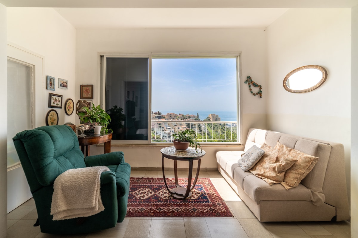 💎 Maluwang at tahimik na apartment sa Haifa na may mga nakamamanghang tanawin 🏞️. Tahimik na lugar, perpekto para sa pagrerelaks🧘. Pribadong patyo na may kamangha - manghang tanawin🌅. High - speed na WiFi📶. Malaking sala na may foldout couch, 85" Smart TV, at AC🛋️📺. Komportableng silid - tulugan para sa tahimik na pagtulog🛏️. Kumpletong kusina🍳. Malaking banyo na may laundry machine🧺🚿. Bottom floor. Naghihintay ang iyong tahimik na bakasyon! Nangungunang Pagpipilian ng 🌟 mga Bisita! 🏆