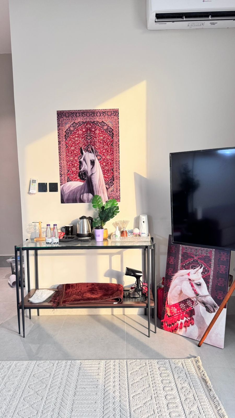 Maligayang Pagdating Ang lugar ay isang apartment na may kuwarto (king bed) + 2 banyo + indoor hall + kusina na bukas sa dining hall. May mga sumusunod na serbisyo sa patuluyan: sariling pag-check in/5G Wi-Fi/malilinis na tuwalya/plantsa/65-inch TV screen/libreng pribadong paradahan sa basement/elevator/presensya ng manggagawa na tutulong kung may anumang problema. Ang pinakakapansin‑pansin sa lugar na ito ay ang pagiging nasa gitna ng Al‑Khobar ito, 6 na minutong lakad mula sa Al‑Khobar Corniche, partikular sa interseksyon ng mga pinakasikat na kalye (King Salman Street at Prince Turki Street), na puno ng mga restawran, cafe, at tindahan