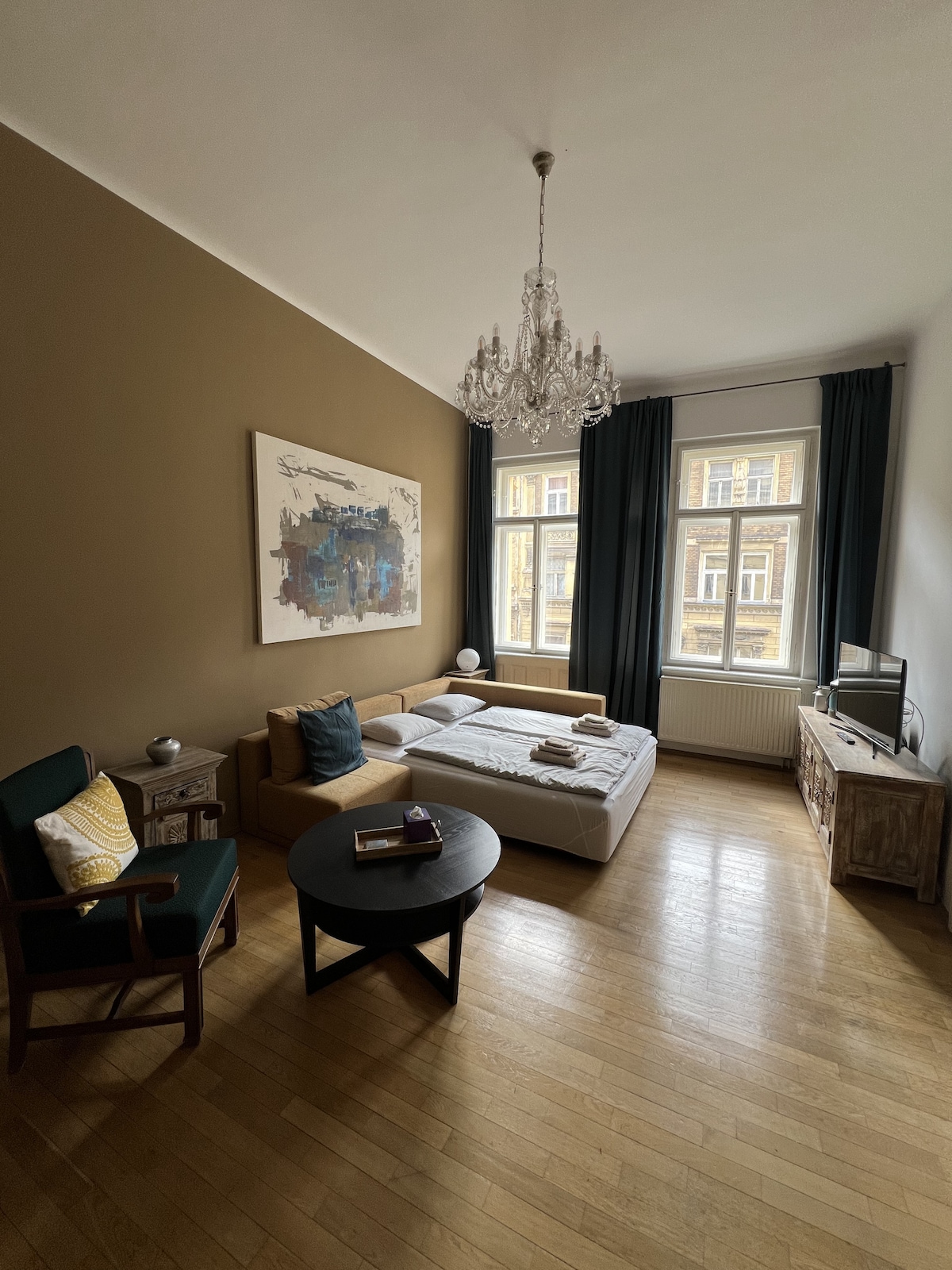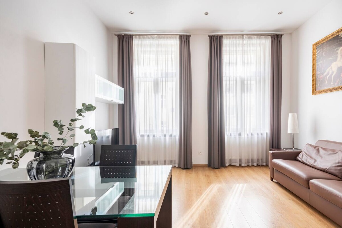 A new, luxury, one bedroom apartment in recently renovated historical building in the old center of Prague. The apt. has very modern interior combined with classic wooden elements. There's a quiet bedroom with double bed and a high quality mattress, a fully equipped kitchen, a comfortable living room with a sofa bed and a separate bathroom. Fast internet. The apt. is perfect for two but it comfortably hosts up to four guests. The building has 24/7 receptionist and security on duty.