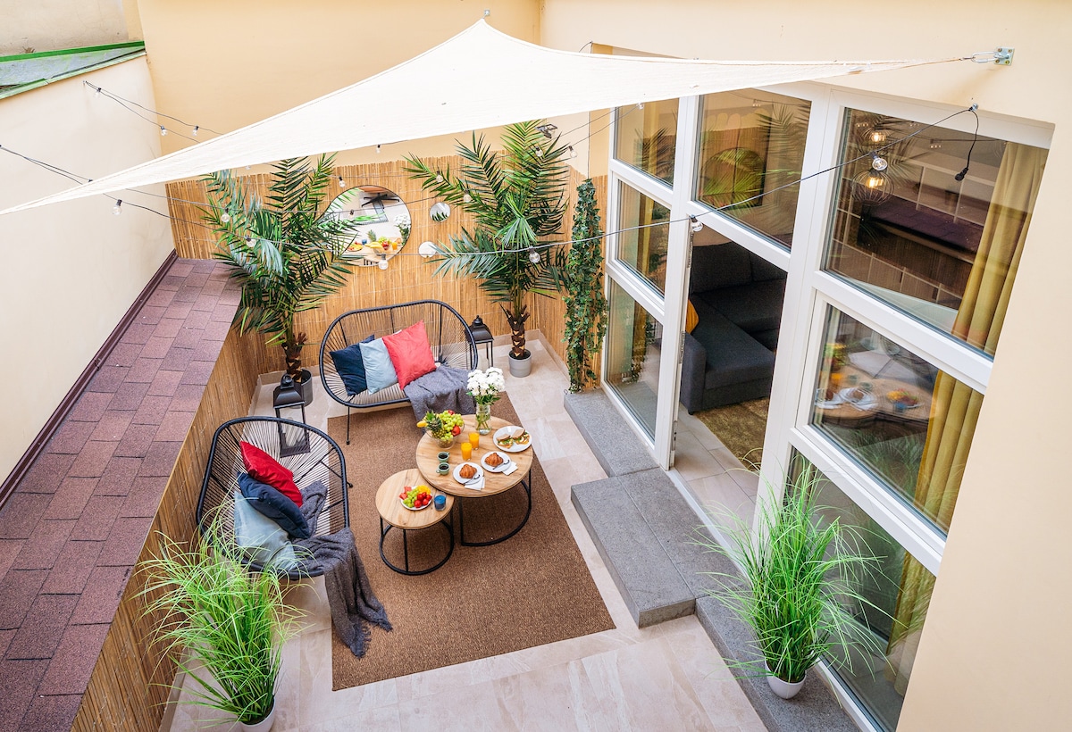 Welcome to our Tropical studio, a charming apartment in the heart of Prague that combines urban living with a beautiful tropical paradise. Uniquely designed with an exotic touch, our space evokes the vibrant vibes of Bali, creating a relaxing oasis in the city's centre. The standout feature, our amazing patio, offers a private slice of paradise, perfect for enjoying your morning coffee or relaxing under the twinkling lights.
