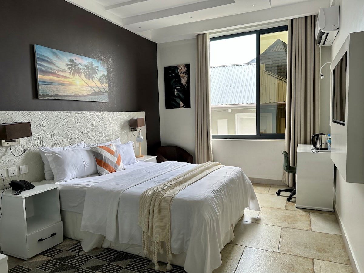 Matatagpuan ang hotel sa gitna ng lungsod ng Dar es Salaam. Malapit lang ang City Center, City Mall, Movie Theater, at Kariakoo Market. Mga Tampok ng Kuwarto: - Komplimentaryong Almusal - Queen size bed - Kuwarto sa harap ng gusali kung saan matatanaw ang Uhuru st. - Step - out na balkonahe - Naka - air condition - Electric Kettle(Tsaa at Kape) - Mini Refrigerator - Libreng High - Speed WiFi - Ligtas na Laptop - Talahanayan ng Pagsusulat - Telepono - 32" LED Television(Cable TV - 250+ Channel) - Pribadong Banyo