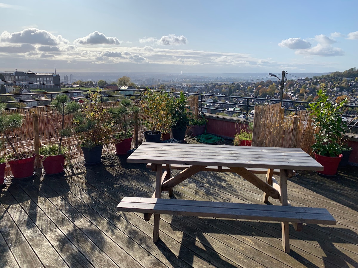 May mga bintanang mula sahig hanggang kisame at terrace, nag - aalok ang gite na ito ng malawak na tanawin ng Rouen. Ang naka - istilong lugar na ito ay may malaking maliwanag na sala na may kusina na bukas sa sala, remote na lugar ng trabaho, 2 silid - tulugan at 1 banyo. Bukod pa rito, matutuwa ka sa kaginhawaan, kalmado, at air conditioning. Libreng paradahan sa kalye Posibilidad na mag - park ng mga bisikleta, scooter o motorsiklo (garahe). 20 minutong lakad mula sa istasyon ng tren at sentro ng lungsod. Malapit na istasyon ng bus