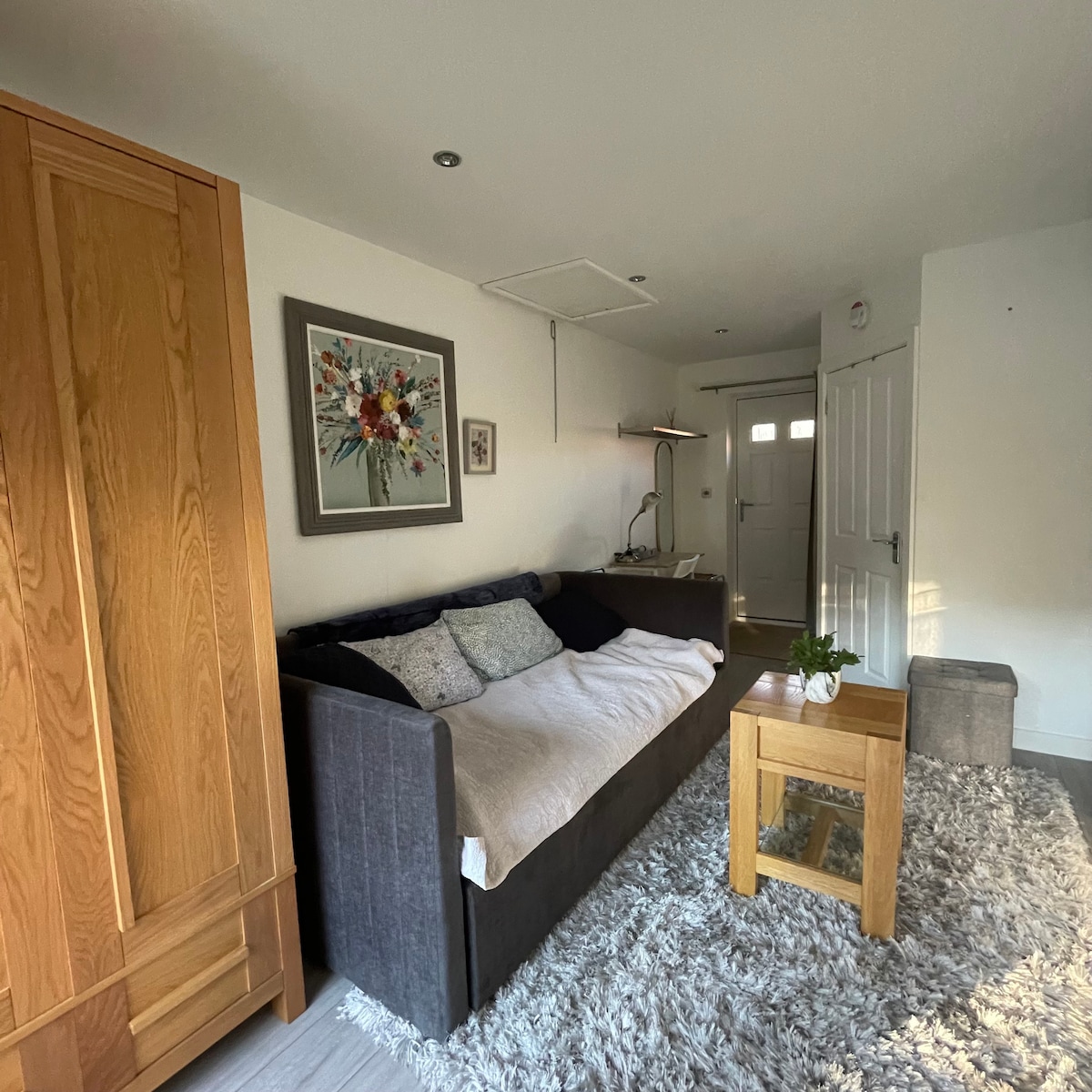 A tranquil, self-contained studio apartment with a private entrance ensures complete privacy. The bedroom includes a comfortable double bed, wardrobe, work desk, ample storage, Smart TV, and convenient amenities. The kitchenette is equipped with a fridge, washer-dryer, microwave, air fryer, and more. The en-suite bathroom features a walk-in shower. Enjoy the cozy, private garden with table and chairs for a relaxing outdoor moment.