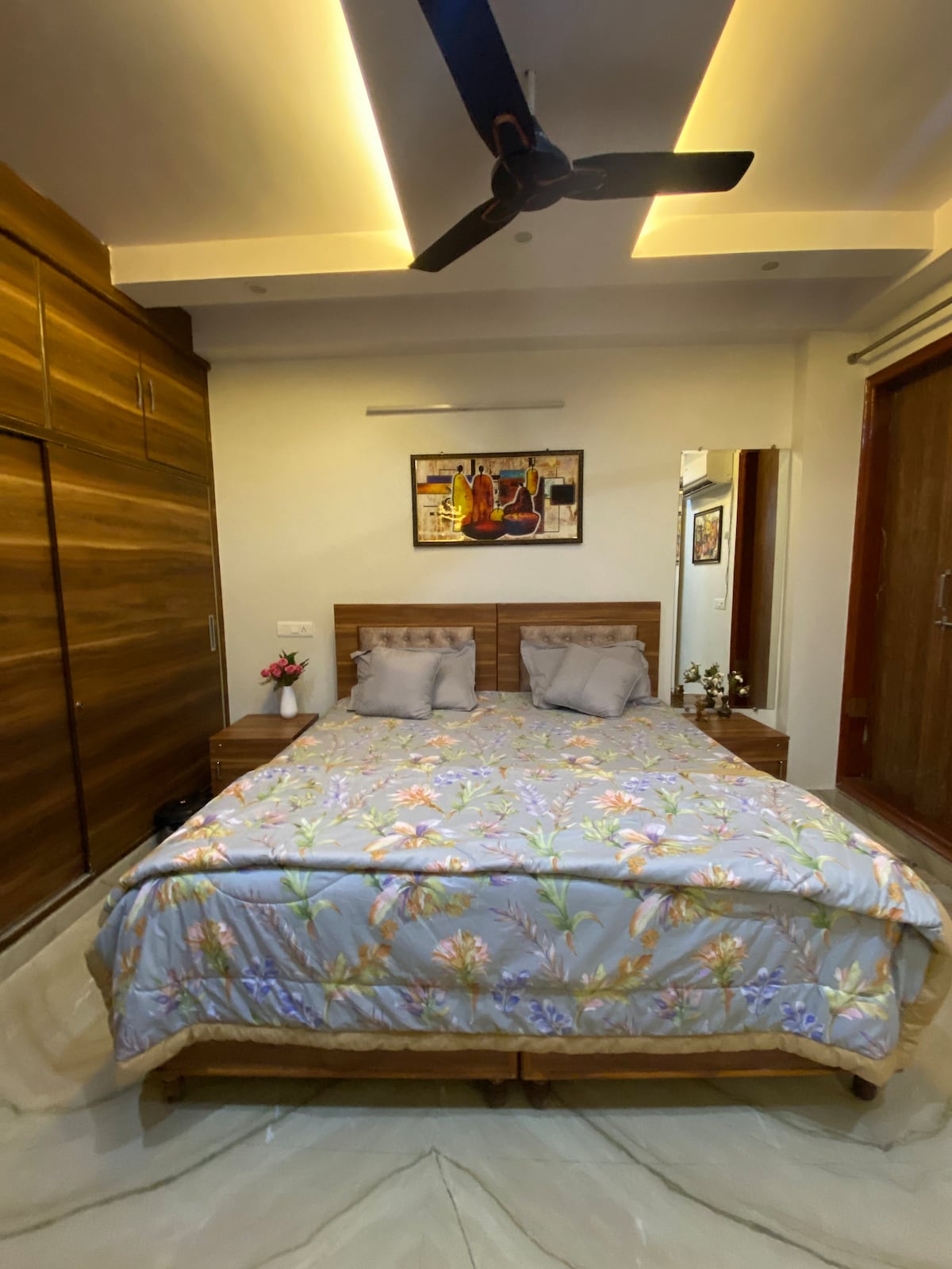 Welcome sa South Delhi Terrace Retreat (Jangpura), isang komportableng pribadong condo na may 1 kuwarto at kusina na may magandang rooftop terrace, na perpekto para sa isang tahimik na pamamalagi sa lungsod. Nasa gitna ito ng isang tahimik na kapitbahayan. Magâenjoy sa natural na sikat ng araw, nakakarelaks na terrace, ambient na ilaw sa gabi, at komportableng setup sa loob. Malapit (tinatayang tagal ng biyahe): Sunder Nursery: ~15 minuto Bharat Mandapam: ~20 minuto Kataas-taasang Hukuman: ~20 min Bangla Sahib: ~20 minuto India Gate: ~25 minuto Qutub Minar: ~35 minuto Red Fort: ~30 minuto