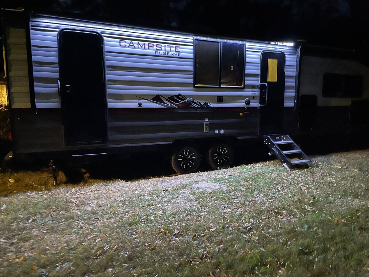 Just outside the buzz of D.C., a hideaway offers a peaceful, romantic retreat in the heart of Lanham. Surrounded by the natural beauty of Prince George's County, this cozy RV features a large full+full sofa bed, a full bed, soft lighting, and windows for golden sunset views. Enjoy intimate meals in the charming kitchenette, then unwind in your outdoor space. Whether you're stargazing or exploring nearby Lake Artemisia, this is the perfect spot to relax and make lasting memories.