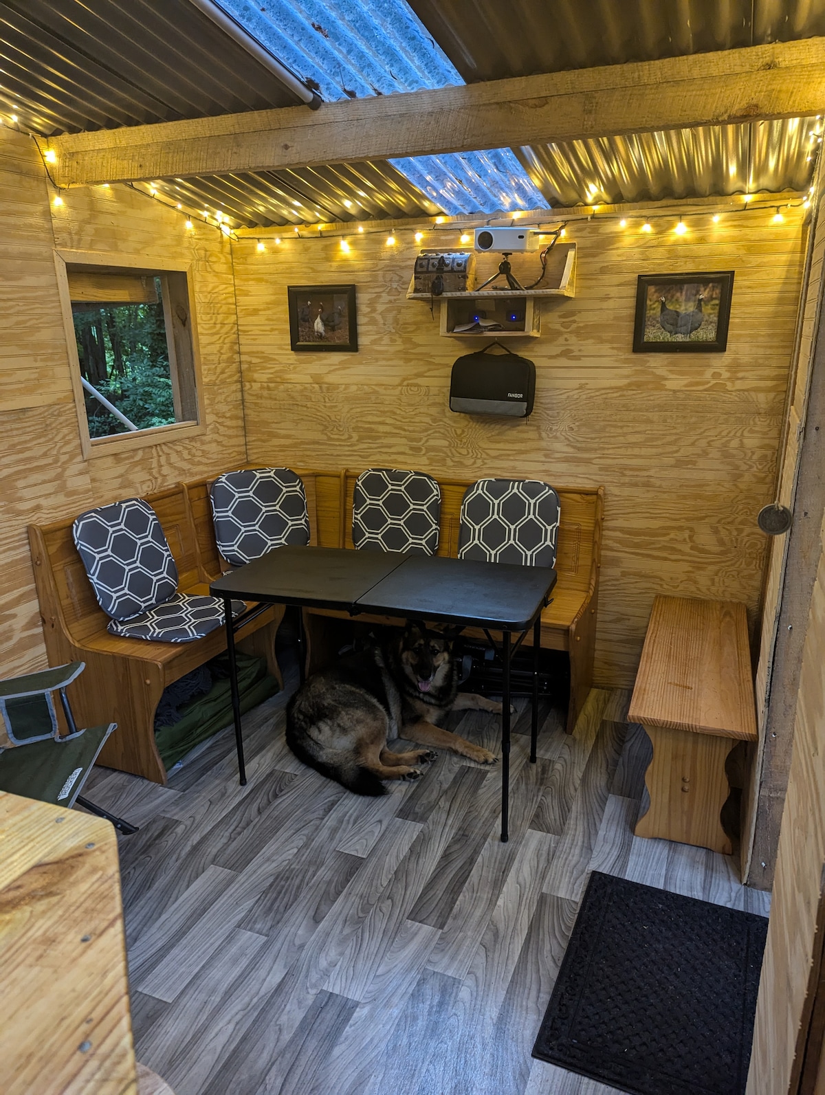 Wisteria Treehouse is an elevated camping structure designed to imerse you in nature. The lower deck hosts a 13' bell tent with cots and camp matresses. Being off the ground keeps the tent drier and invites a nice breeze. The Treehouse itself is a renovated hunting blind turned into a sheltered spot relax and take in the view. Secluded on a private 2.5 acre lot in the corner of a specialty bird farm. Guinea Fowl will wander by at times as they make their rounds. Newly added N64+Mariokart