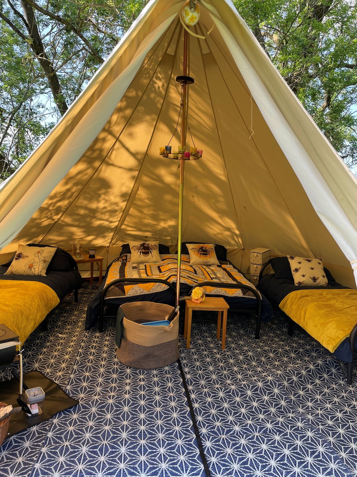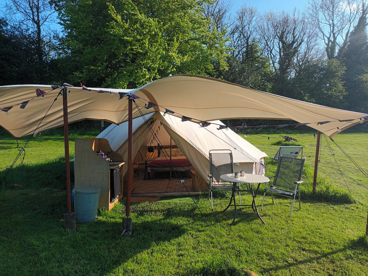 Tumakas sa magagandang labas nang hindi isinasakripisyo ang kaginhawaan sa aming 5 - meter bell tent na may magagandang kagamitan. Matatagpuan sa tahimik na bahagi ng site, at may mga nakakamanghang tanawin, nag - aalok ang karanasang ito ng perpektong balanse ng kagandahan sa kanayunan at mga modernong amenidad. ang kampanilya ng kampanilya ay nasa bahagi ng south view farm pop up campsite Ang aming kampanilya ay may double bed beds 2 ngunit ang mga karagdagang bisita ay malugod na tinatanggap sa isang maliit na dagdag na gastos na nagbibigay kami ng dalawang solong komportableng camp bed na kailangan lang ng mga bisita na magdala doon ng sariling bedding