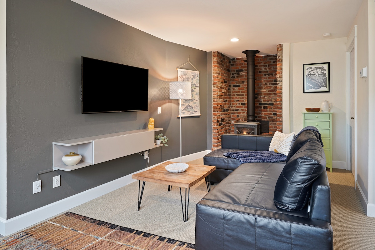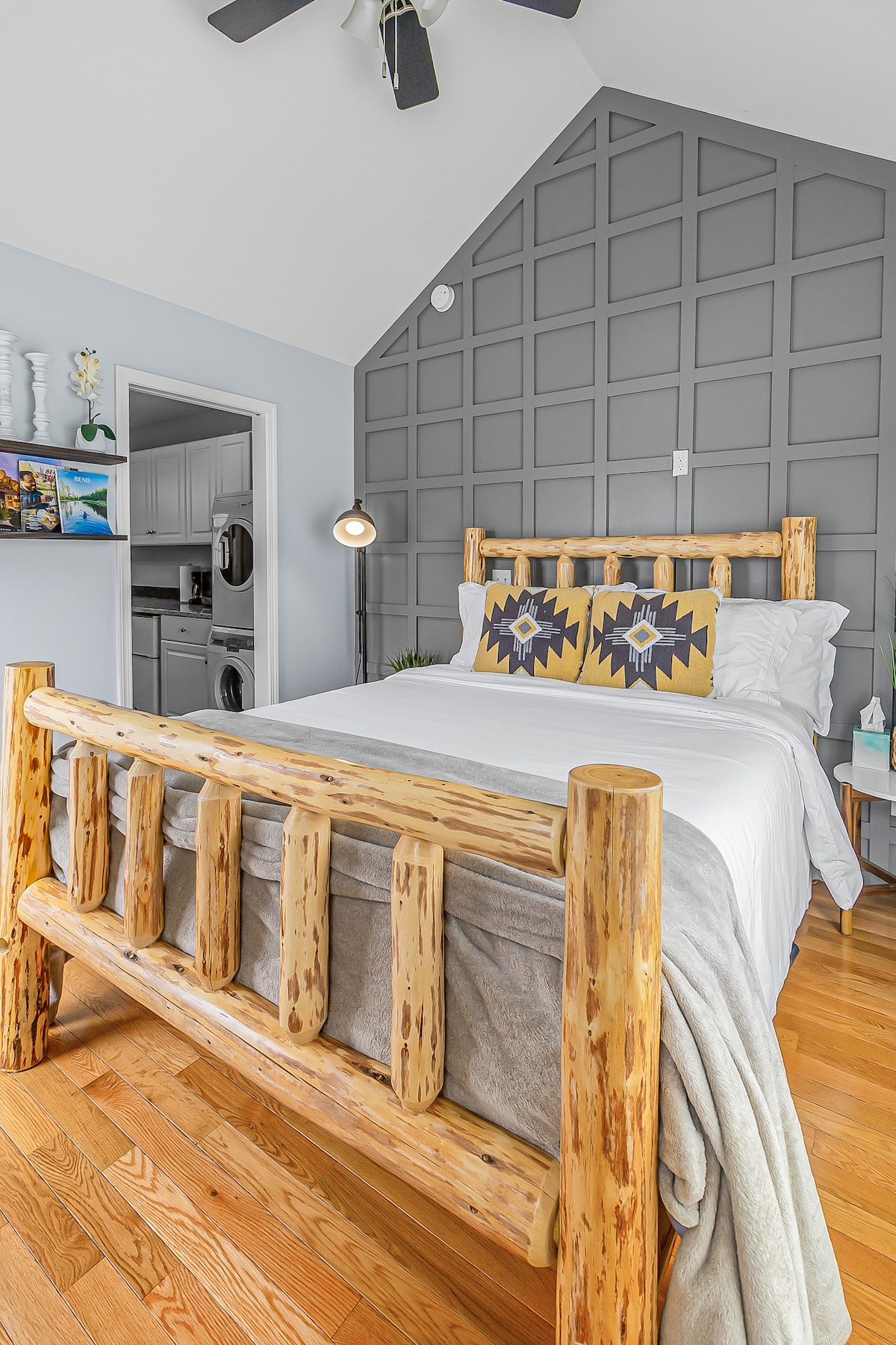Nestled above the garage, this cozy one-bedroom, one-bathroom apartment offers privacy and tranquility with no shared walls with the main house. Surrounded by lush juniper and pine trees, each window frames a serene, treehouse-like view, letting you feel fully immersed in nature. The fully stocked kitchen is perfect for preparing meals, whether it's a quiet breakfast or a gourmet dinner. After a day of exploring, relax by the cozy fireplace, adding warmth and comfort to your stay.