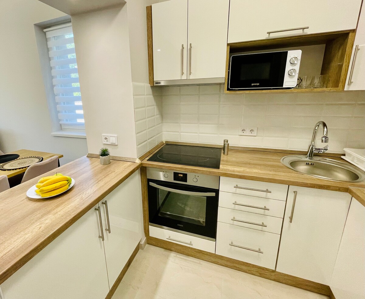 Mainit na inirerekomenda ang apartment para sa mga gustong pumasok sa kalmadong kapaligiran, pero malapit pa rin sa sentro ng lungsod. May libreng paradahan, malapit na pampublikong transportasyon at 10 minutong lakad mula sa sentro, mahahanap mo ang 2 - room apartment. Malugod din naming tinatanggap ang pagdating ng mga bata, kung saan posible na magkaroon ng kuna. Sinubukan naming lagyan ang apartment sa modernong paraan, na may mga kabinet, komportableng kutson at mga linen, kumpleto sa kagamitan ang kusina.