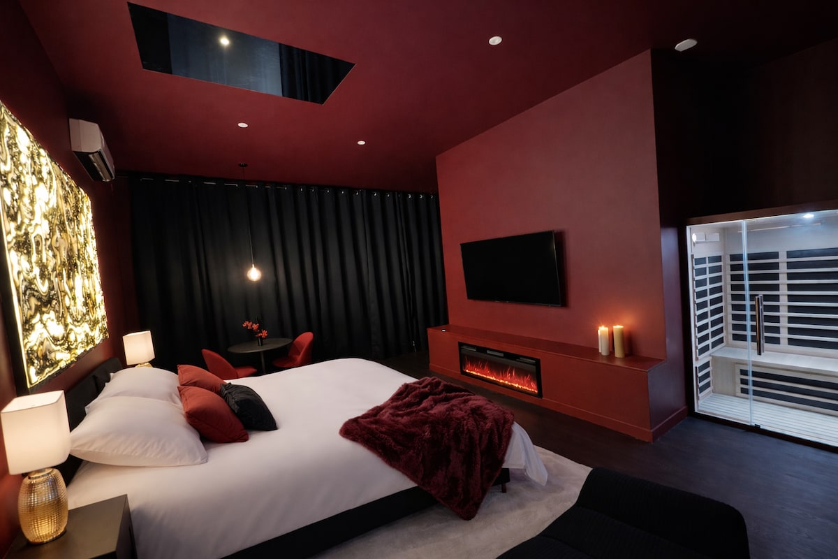Magbakasyon nang magkasama... Sa kuwartong para sa inyo Magbakasyon sa lugar na idinisenyo para sa pagsasama‑sama! Hanapin ang sarili mo, mag‑isa o bilang magkasintahan, sa isang cocoon ng intimacy kung saan idinisenyo ang bawat detalye para magdulot ng mga emosyon, muling magpasigla ng pag‑iibigan, at lumikha ng mga di‑malilimutang alaala. Isipin mong nasa pribadong spa ka o nasa king‑size na higaan habang nakikinig sa playlist mo o nanonood ng streaming na ipinapalabas ng video projector.