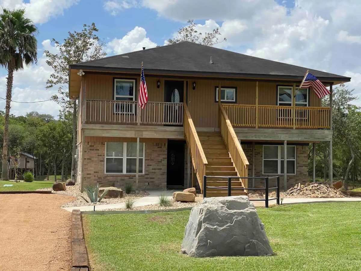 Dalhin ang buong pamilya sa magandang lugar na ito na may maraming lugar para magsaya. Ang pangunahing silid - tulugan ay may king size na higaan, may queen size sa likod na silid - tulugan, at ang silid - tulugan sa harap ay may dalawang twin bed. Buong Kusina, na may buong sukat na refrigerator at kalan. Dalawang banyo. Humigit - kumulang 100 talampakan ang cabin na ito mula sa Ilog Guadalupe na may mahusay na pangingisda at malalim na tubig sa pantalan. Available ang mga canoe at kayak.