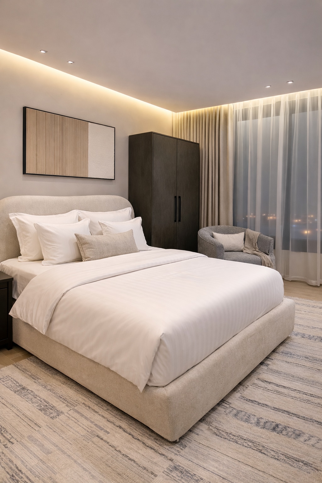 - Elegante at tahimik na smart access suite: isang silid - tulugan, isang lounge na may smart TV screen, banyo at maliit na kusina. - Madiskarteng lokasyon na napapalibutan ng koleksyon ng mga mall, shopping venue, restawran, cafe, cafe, service center, at accessible na paglalakad - Naka - istilong walkway sa likod ng tirahan - Leather, Beauty & Laser Clinic - nang naglalakad - Suite 2D lakad mula sa Aloft Dhahran Hotel Ballroom (Convention & Events) - Ang ward ay may average na 10 minuto mula sa Johns Hopkins Aramco Medical Center - 15 minuto ang layo ng pakpak mula sa King Fahd Causeway