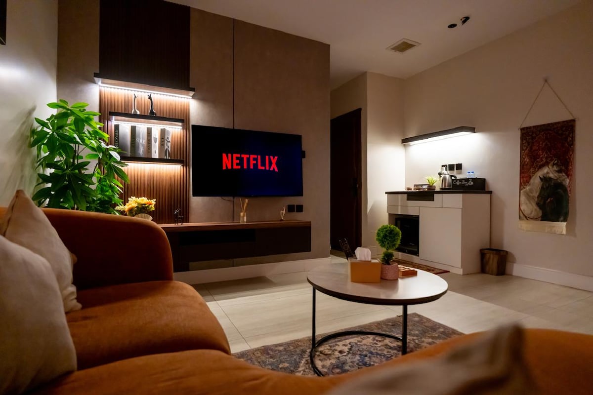 • 📺 Isang marangyang entertainment program na may kasamang lahat ng sports at internasyonal na channel • 🎬 Isang platform para sa mga de-kalidad na pelikula at serye • 🌐 High - speed na Wi - Fi • 📺 65" smart screen para sa karanasan sa panonood ng pelikula • 🛏️ Marangyang kuwarto na may eleganteng disenyo • 🛌 Karagdagang higaan kapag hiniling nang may bayad • ✨ Modernong dekorasyon na may eleganteng mga detalye ng hotel • 🍽️ May restawran sa gusali • ☕ Napakagandang mga cafe malapit sa lokasyon • 📍 Isang natatanging lokasyon na madaling puntahan • 🕊️ Kumpletong privacy at katahimikan