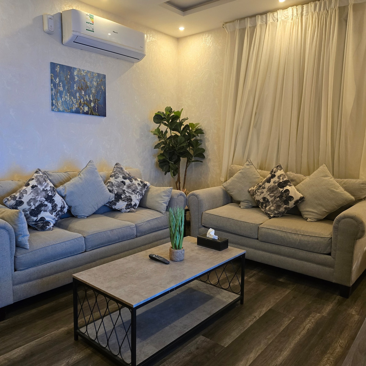 Boho - style retreat sa Al Narjis! Komportableng apartment na 1Br na may sala, kumpletong kusina, 2 banyo, at mesang kainan na may 4 na upuan. Ang mga likas na halaman ay nagdaragdag ng pagiging bago, malambot na ilaw at mainit na tono ay lumilikha ng nakakarelaks na vibe. Mainam para sa mga solong biyahero, mag - asawa, o maikling pamamalagi. Kasama ang mabilis na Wi - Fi, AC, at paradahan. Masiyahan sa kaginhawaan, estilo, at mapayapang pamamalagi sa Riyadh sa bago at nakakaengganyong tuluyan.