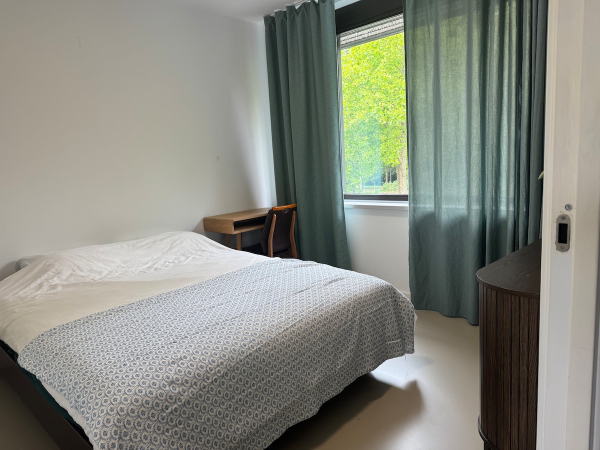 Maluwag na kuwartong pang‑dalawang tao na may king‑size na higaan, aparador, at munting workspace na may natural na oak desk. Mabilis na WiFi, cotton linen, mga premium na materyales at karangyaan. Kasama mo kaming mamalagi sa aming bahay na may apat na kuwarto—isang mag‑asawang mahilig bumiyahe. Kumpleto ang gamit sa kusina, at may malaki at magandang parke sa tapat mismo ng kalye. 5 minuto lang ang layo ng Metro Ganzenhoef, at dadalhin ka ng line 53 sa Central Station sa loob ng 18 minuto. Pinahahalagahan namin ang mga magalang na bisita na nagkakaroon ng tahimik at komportableng pamamalagi.
