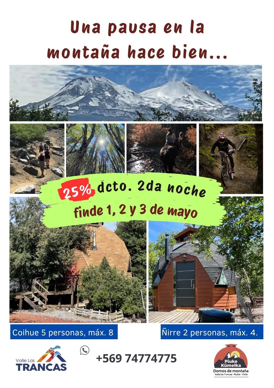 Halika at tamasahin ang isang hindi malilimutang bakasyunan sa Domos Piuke Kümelka, na matatagpuan sa gitna ng lambak ng Las Trancas, Km.69 ng Route N -55 na may magandang tanawin ng bulkan, na napapalibutan ng katutubong kagubatan at mga trail na nag - iimbita sa amin na pag - isipan at idiskonekta mula sa pagiging. Maaari kang magpahinga, mag - enjoy at mag - renew ng iyong enerhiya sa pamamagitan ng positibong epekto na ibinibigay sa amin ng bundok at sa pakikipag - ugnayan sa kalikasan.