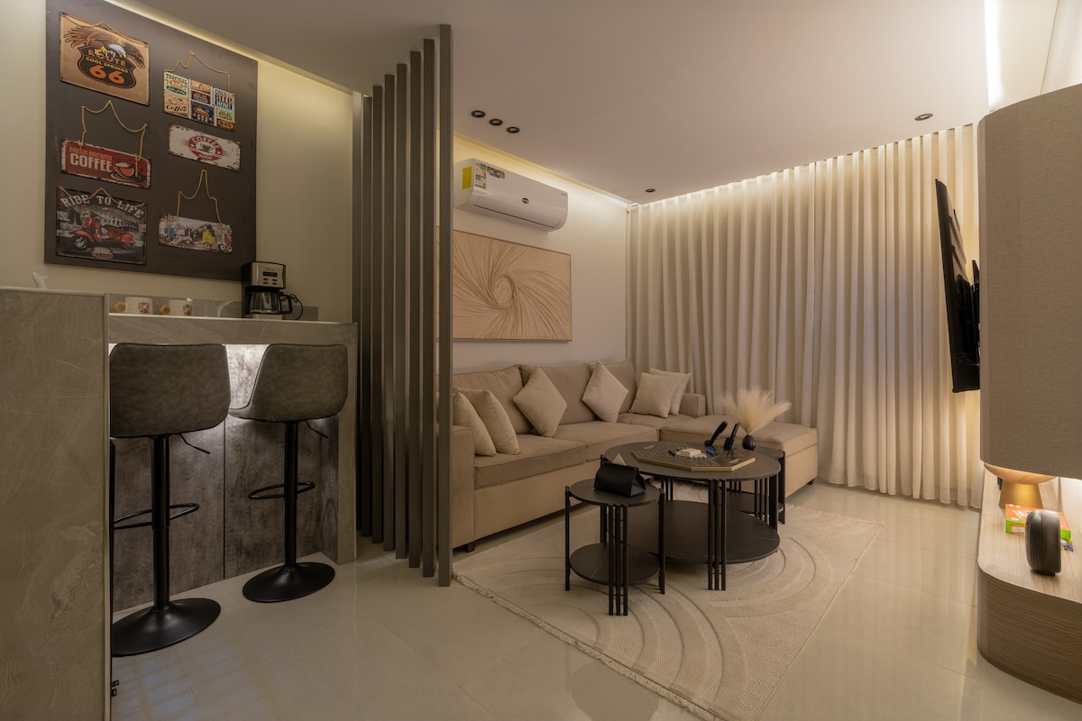 Matatagpuan sa Riyadh, kapitbahayan, nagtatampok ang komportableng modernong apartment na ito ng smart lock para sa ligtas at pinagsasama ang kaginhawaan at kaginhawaan sa puso ng Riyadh. Sa mga kaganapan sa Riyadh Season sa malapit at Boulevard World/City ilang minuto lang ang layo, perpekto ito para ma - enjoy ang masiglang libangan ng lungsod. Napapalibutan ng mga pamilihan, coffee shop, at restawran, malapit na ang lahat. Sa loob, nagtatampok ang apartment ng kontemporaryong disenyo na may mga makinis na muwebles, mainit na ilaw, na lumilikha ng kaaya - ayang kapaligiran.