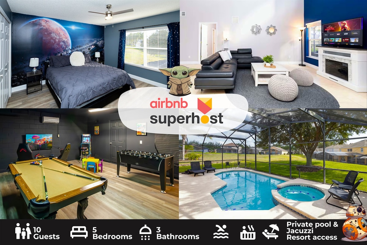 Magrelaks at mag - enjoy ng mapayapang bakasyon kasama ng pamilya at mga kaibigan sa aming magandang tuluyan na 3 milya lang ang layo mula sa Disney World. Nilagyan ang aming bagong na - renovate na game room ng 4 na Arcade Machines, Pool Table, at Air Hockey. Masiyahan sa pribadong pool at kusinang kumpleto ang kagamitan. Kamakailan lamang ay na - upgrade ang smart home na may smart color LED lights sa buong lugar. Ang aming komunidad ay ang pinakamalapit sa Disney at iba pang mga theme park. Matatagpuan kami sa loob ng 6 na minuto mula sa mga atraksyon, kainan, at pamimili. Spa/sauna avail @househouse Ni - renovate lang ang pool