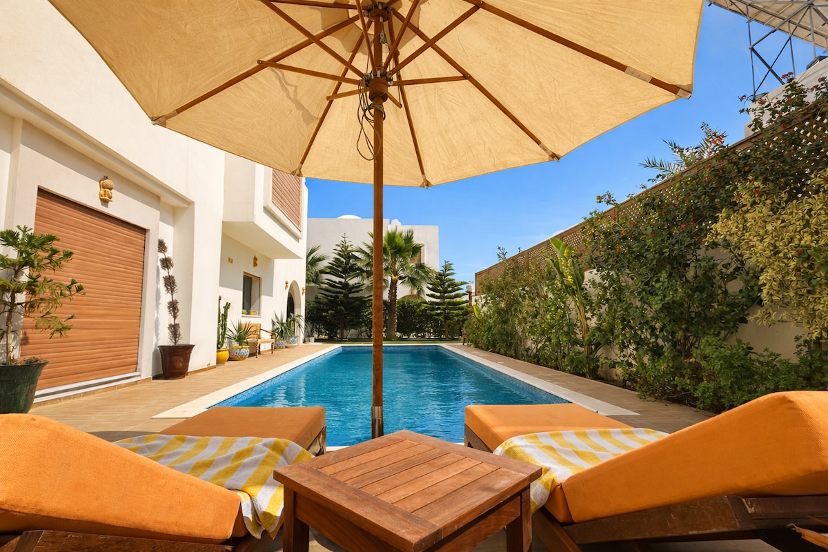 🌴 Matatagpuan ang aking Hanchiri villa sa Tezdaine, Djerba, sa isang elegante, tahimik, at ligtas na kapitbahayan, 4 na minuto lang mula sa Saguia Beach. Mayroon itong pribadong pool na may tanawin ng dagat, 3 kuwartong may air-con, maliwanag na sala, at kusinang kumpleto sa kagamitan. 🚲 May 2 bisikleta para sa inyong mga paglalakad sa kalikasan