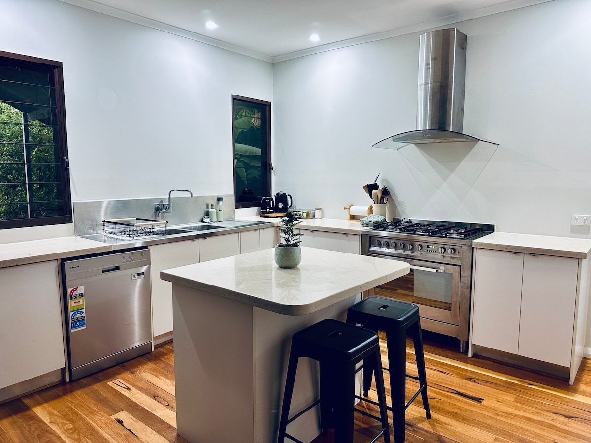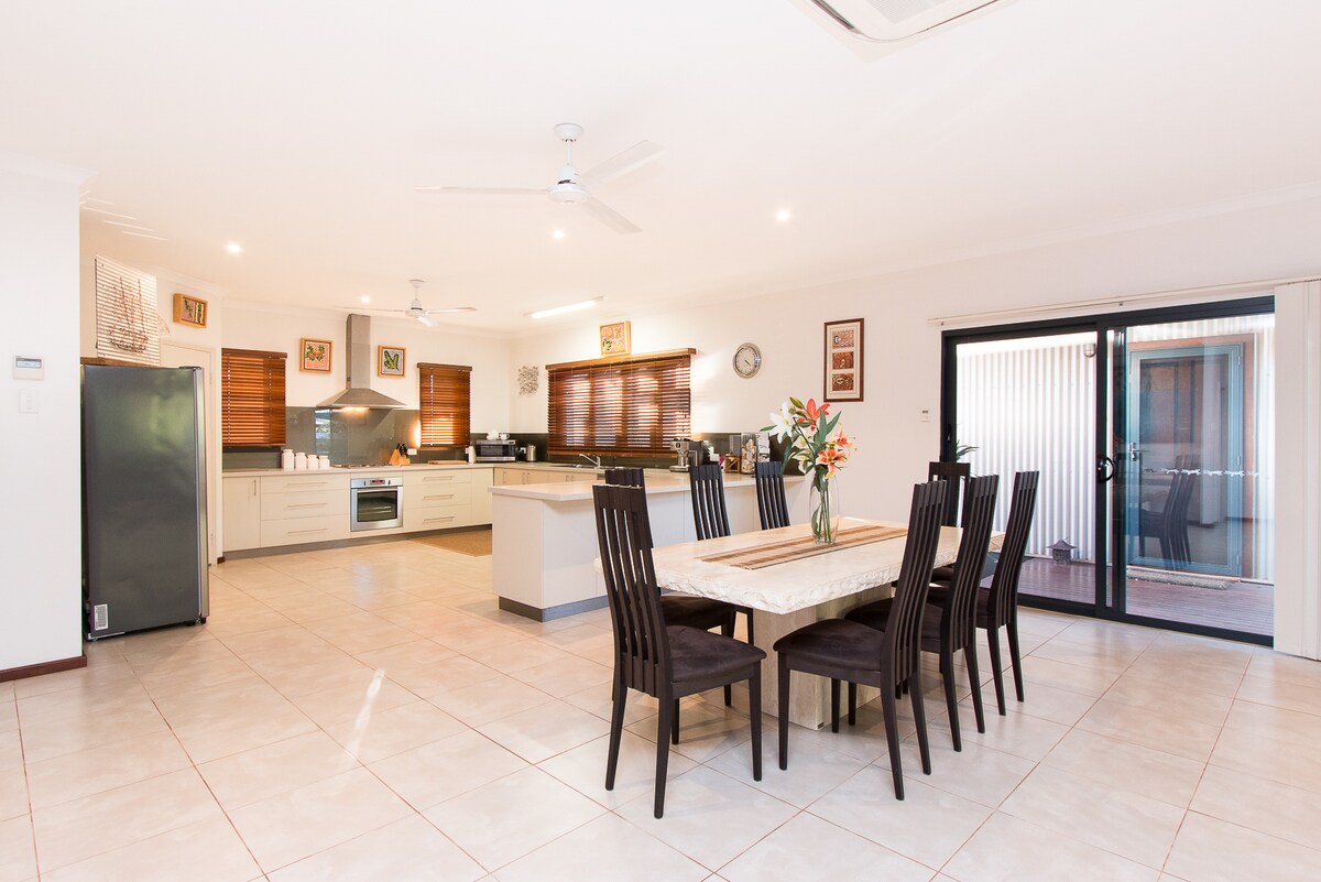 Maluwang na 3-bed retreat sa tahimik na Cable Beach. Napapaligiran ng malalagong harding tropikal, may malaking pool, deck para sa libangan, at lugar para sa mga bata. Nagdaragdag ng init at alindog ang mga muwebles na may estilong Balinese at magandang sining ng mga Aboriginal. May dalawang kuwartong may king size bed na may iisang banyo; may queen size bed at ensuite ang master. Maraming libro, laruan, at laro para sa mga bata. Matatagpuan sa tahimik na pampamilyang cul‑de‑sac na maraming paradahan sa tabi ng kalsada, kabilang ang para sa caravan. Magrelaks, magpahinga, at mag‑enjoy sa Kimberley.