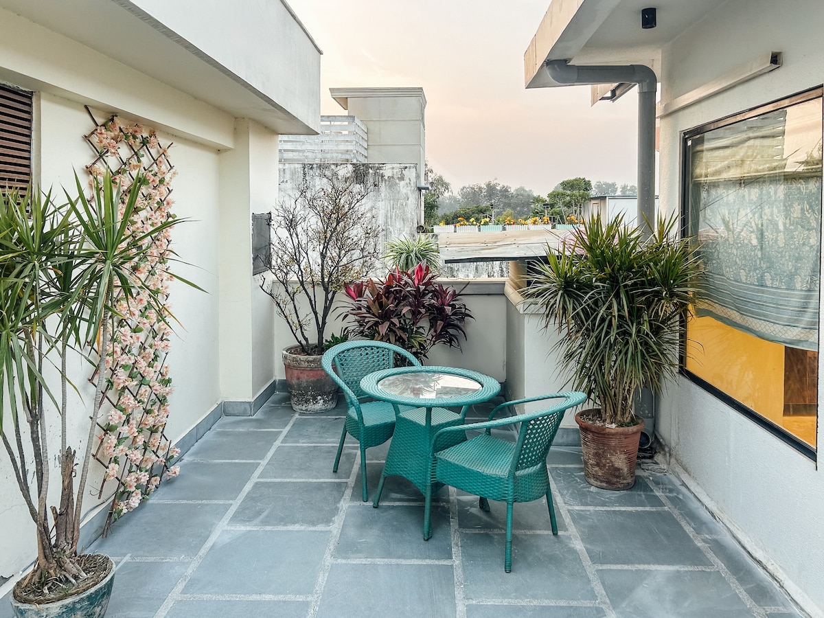 • H13/ HEPA Room Air Purifier • Araw-araw na Paglilinis at Malilinis na Tuwalya • Tagapag‑alaga mula 10:30 AM hanggang 7 PM • Smart TV na may Netflix, Amazon Prime, atbp. • High Speed Internet na Wi-Fi • 5-7 minuto mula sa Mehrauli Fashion Street (Pinakamagandang Nightlife sa Delhi) at Saket Citywalk Mall • 5 minuto mula sa Delhi Metro Maligayang pagdating sa onnyxrooftop Nag‑prepare ako ng marangyang bakasyunan sa South Delhi, Central NCR. Mag-enjoy sa mga Mararangyang Kuwarto, Magandang Sala, at Pribadong Pergola Lounge sa Rooftop na may Hot Tub at Bar.
