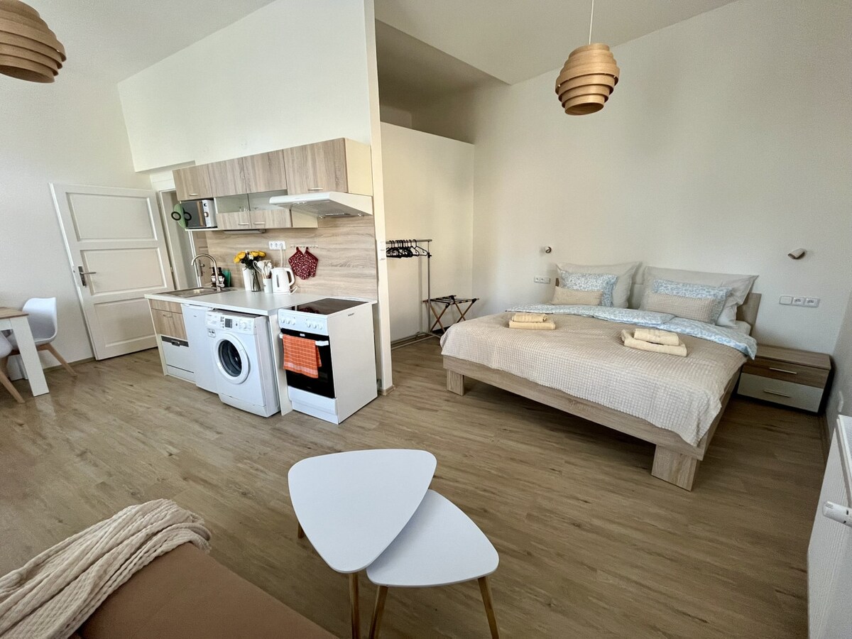 Tuklasin ang kagandahan ng modernong pamumuhay sa aming designer studio sa Hagibor complex! Masiyahan sa kaginhawaan ng tuluyan na may kumpletong kusina, coffee maker ng Nespresso, at nakakarelaks na libro o gabi sa Netflix. May balkonahe, paradahan ng garahe, at mabilis na internet, ito ay isang oasis ng kalmado sa mataong lungsod. Maikling lakad lang mula sa istasyon ng metro ng Želivského sa berdeng linya, ilang sandali ang layo mo mula sa makasaysayang sentro ng lungsod. Ang perpektong lugar para sa iyong paglalakbay sa lungsod!:-)